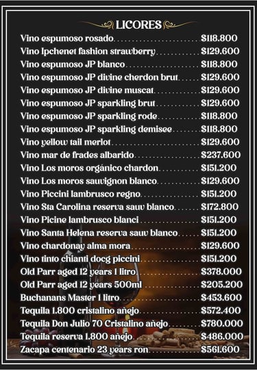 Bebidas y Licores: Nuestra carta de bebidas incluye jugos naturales , limonadas , cervezas nacionales e internacionales , y una amplia variedad de cócteles y licores.