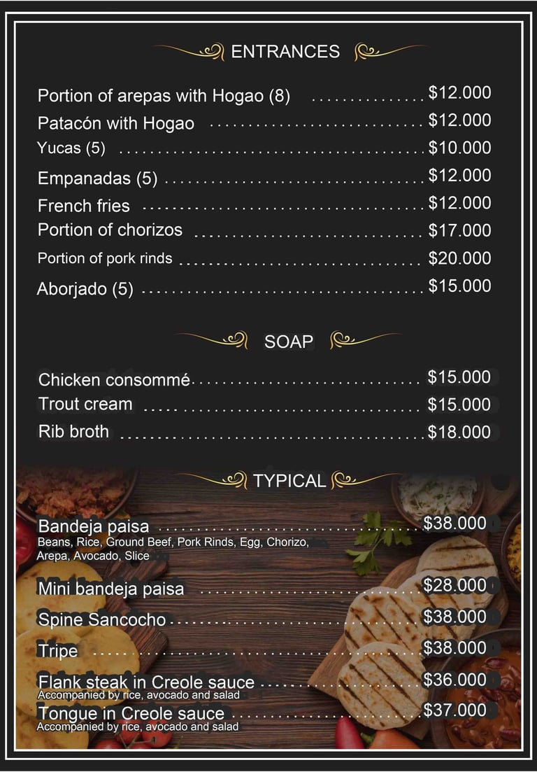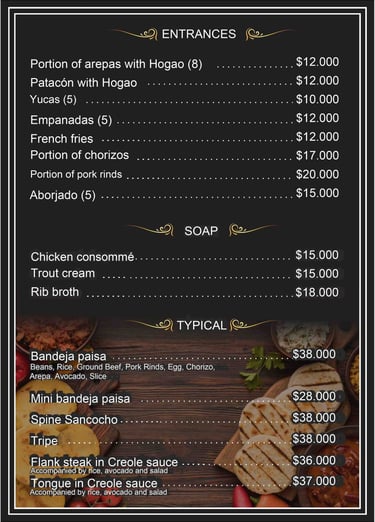 Typical Food : You can't leave without trying our iconic bandeja paisa, a complete dish with beans, rice, ground beef, pork rinds, egg, chorizo, arepa (corn pastry), avocado, and tajada (flat pastry). If you prefer something lighter, the mini bandeja paisa is the perfect option. We also offer sancocho de espinazo (backbone stew), tripe, and flank steak in Creole sauce.