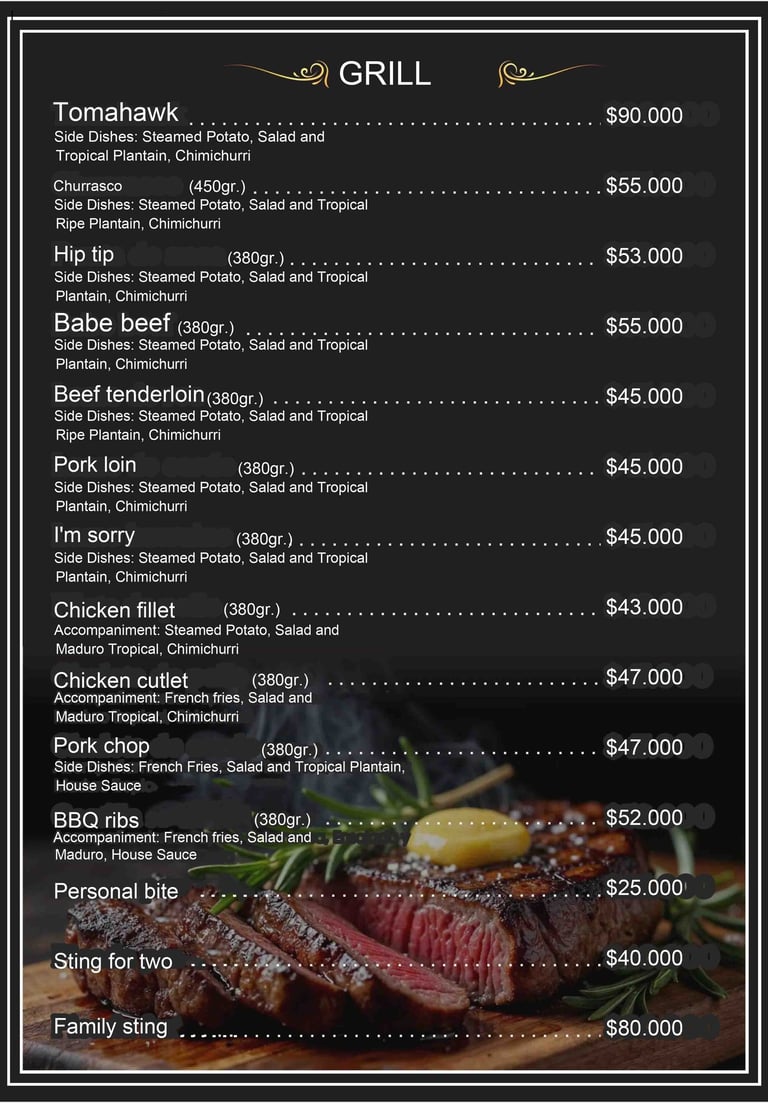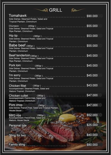 Our Grill : For meat lovers, our grill offers prime cuts like tomahawk, ribeye, rump steak, and beef tenderloin. We also prepare steak and chicken chops, pork chops, and BBQ ribs.