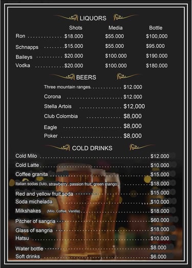 Our menu is based on the culinary richness of Colombia, with a menu designed for all tastes. From appetizers that whet your appetite, such as arepas with hogao and empanadas, to main dishes that are a true tribute to tradition.
