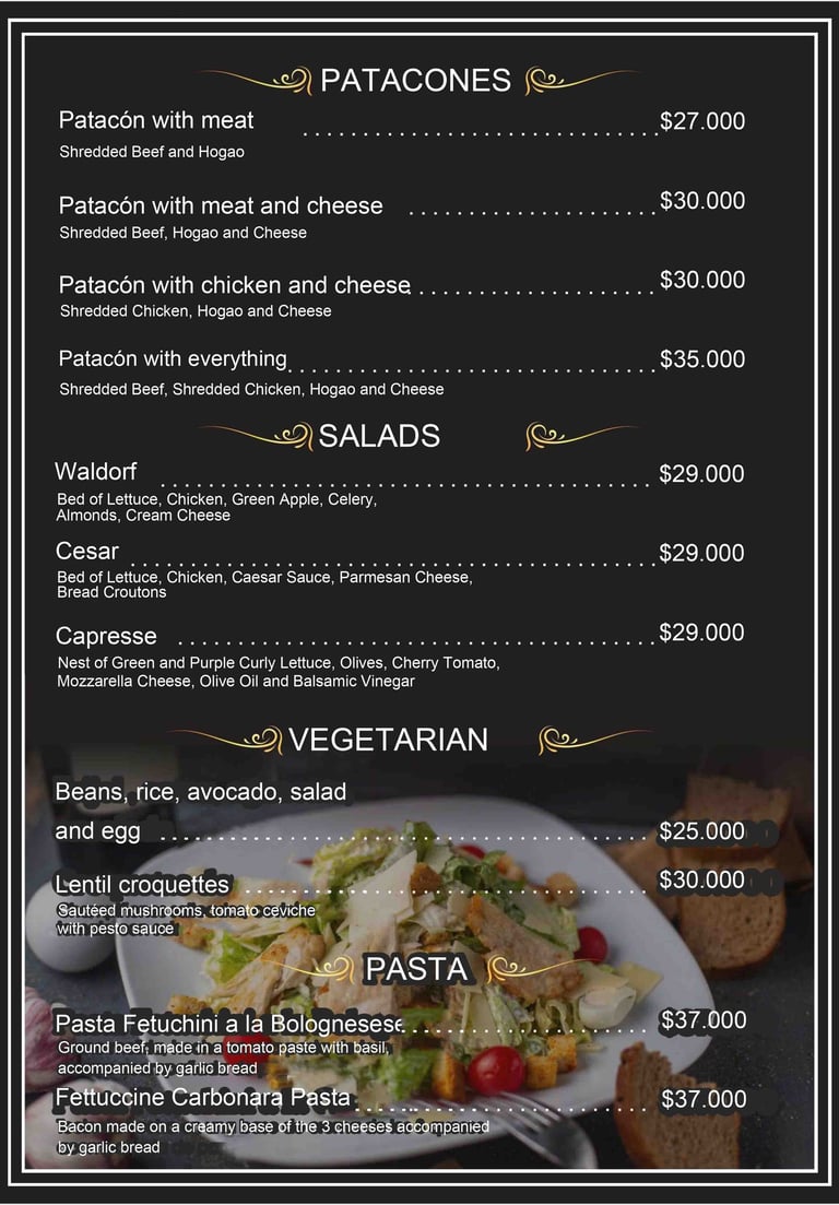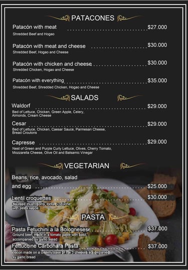 Patacones and Arepas : If you're looking for something more casual, our patacones with meat and cheese or our mixed arepa with chicken, meat, pork rinds, and cheese are the ideal choice.