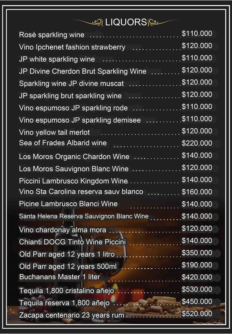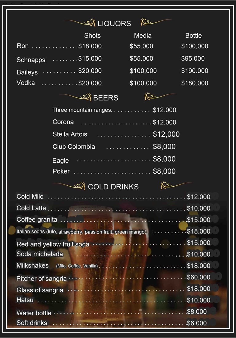 Drinks and Liquors : Our drinks menu includes natural juices, lemonades, national and international beers, and a wide variety of cocktails and liquors.