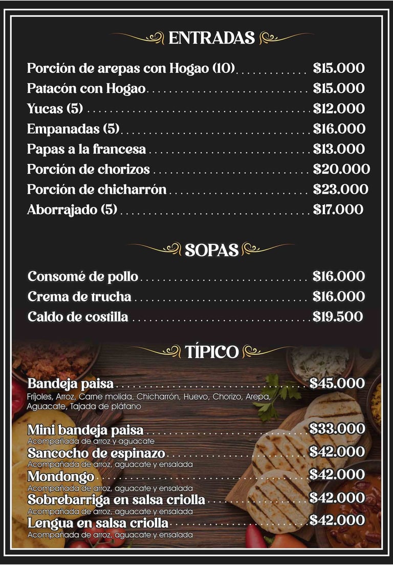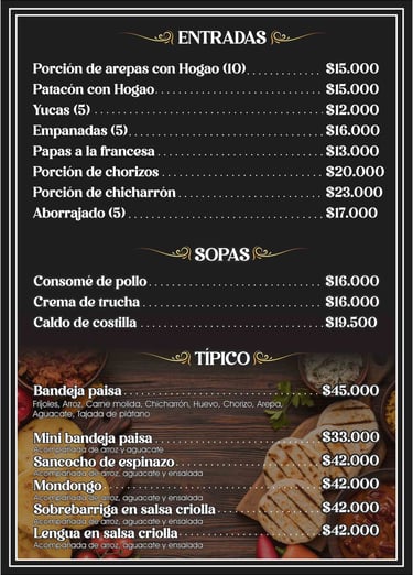 Nuestra propuesta se basa en la riqueza culinaria de Colombia, con una carta pensada para todos los gustos. Desde entradas que despiertan el apetito , como las arepas con hogao y las empanadas , hasta platos principales que son un verdadero homenaje a la tradición.