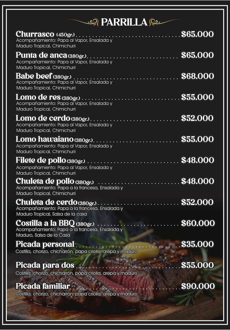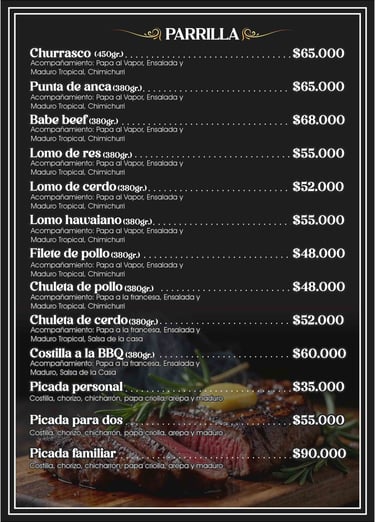 Nuestra Parrilla: Para los amantes de la carne, nuestra parrilla ofrece cortes de primera calidad como tomahawk, churrasco, punta de anca y lomo de res. También preparamos filete y chuleta de pollo, chuleta de cerdo y costillas BBQ.