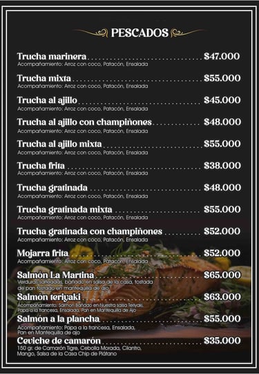 Pescados Frescos: La trucha es la reina de nuestra cocina. La preparamos de múltiples maneras: a la Martina, marinera, al ajillo, gratinada, o simplemente frita. Todos los platos de trucha vienen acompañados de ensalada, patacón o arroz con coco.