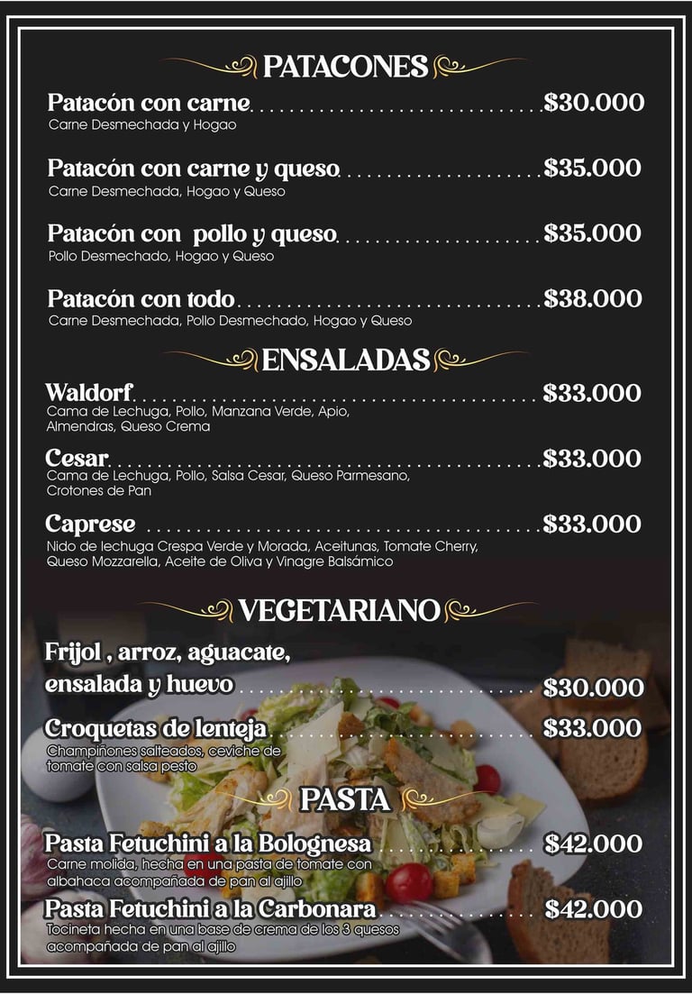 Patacones y Arepas: Si buscas algo más informal, nuestros patacones con carne y queso o nuestra arepa mixta con pollo, carne, chicharrón y queso son la elección ideal.