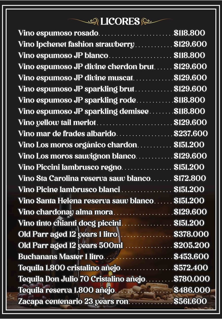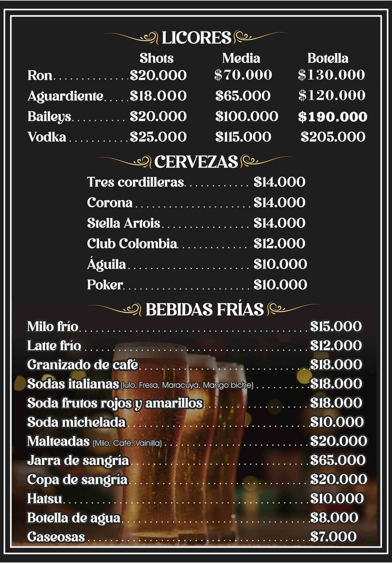 Bebidas y Licores: Nuestra carta de bebidas incluye jugos naturales , limonadas , cervezas nacionales e internacionales , y una amplia variedad de cócteles y licores.